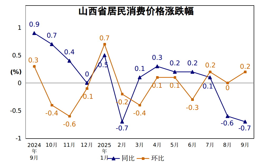 2025年9月份,山西省居民消费价格同比下降0.7%,降幅比上月扩大0.1个百分点。其中,城市下降0.6%,农村下降1.0%;食品价格下降5.8%,非食品价格上涨0.5%;消费品价格下降1.4%,服务价格上涨0.5%。1—9月山西省居民消费价格比去年下降0.1%。
